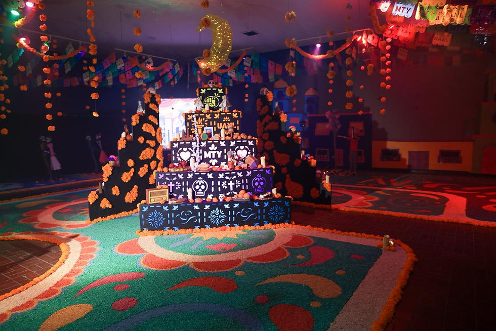 La Dirección de Turismo es Cultura, en colaboración con la Facultad de Artes Visuales de la Universidad Autónoma de Nuevo León, instaló una ofrenda de grandes dimensiones en la modalidad inmersiva.